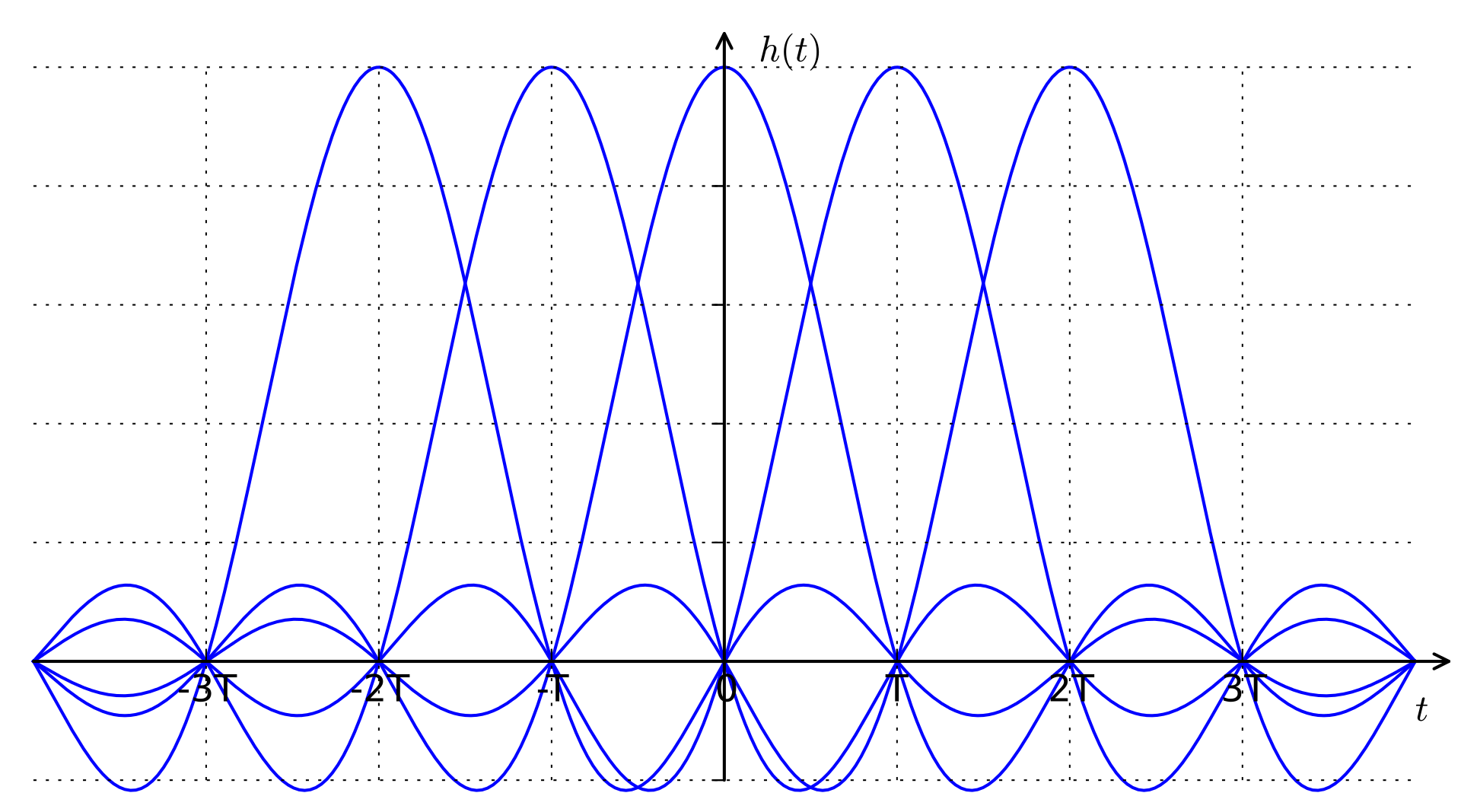 Ilustración de la cancelación de interferencia entre símbolos por la coincidencia de los máximos en los nulos de los pulsos adyacentes (Fuente: WikiMedia)