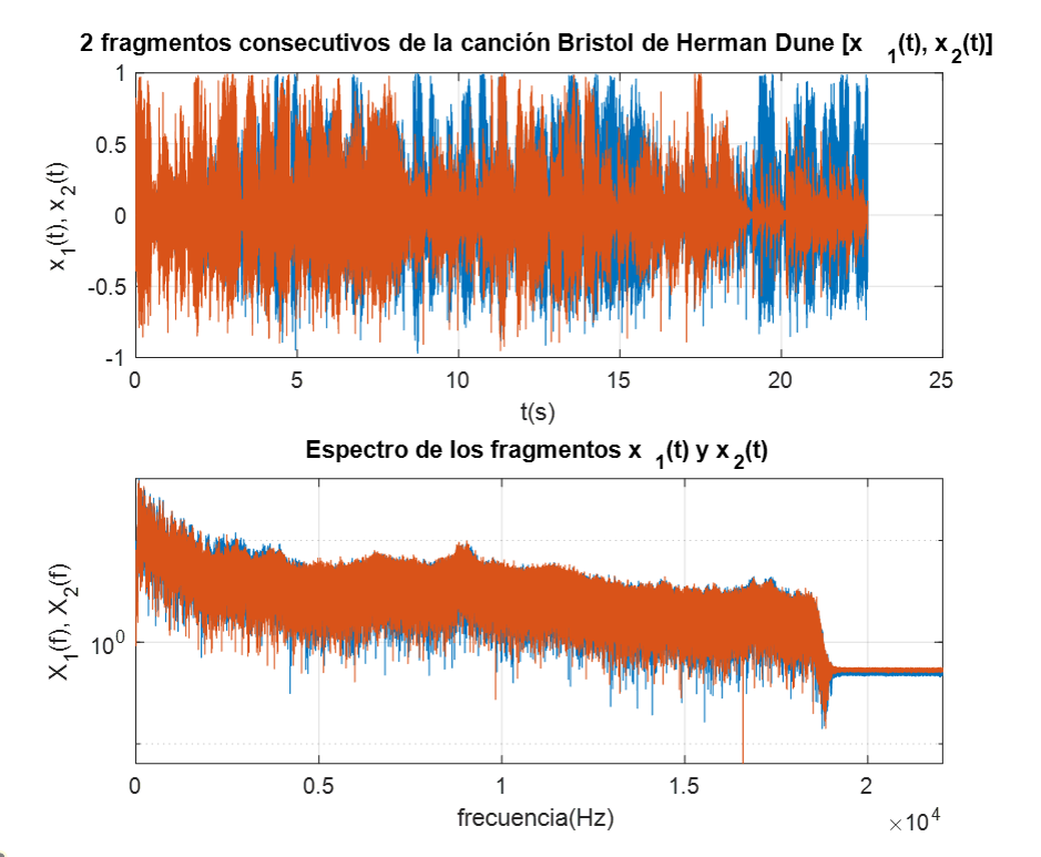 Representación temporal y espectral de dos fragmentos consecutivos de una señal musical monoaural.