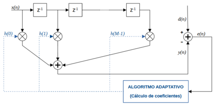 Los filtros FIR son los más ampliamente utilizados en el filtrado adaptativo. Por lo tanto partimos de un filtro FIR de coeficientes adaptativos implementado en su estructura directa (ver figura), donde es la señal a la entrada del filtro, la señal a su salida, la señal deseada y es la respuesta al impulso del filtro de coeficientes .