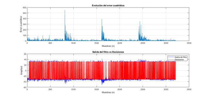 Como ejemplo, se representa gráficamente la evolución del error cuadrático a la salida del decisor adaptativo, a partir del vector de error e, y la comparativa entre las decisiones d y las salidas del filtro adaptativo y. En este caso, el decisor se intenta adaptar a un canal multitrayecto con 4 variaciones temporales equidistantes. En la figura 2 se puede observar la convergencia del error después de cada cambio.