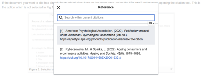 If the document you want to cite has already been added elsewhere on the same page, select the “Re-use” option when opening the citation tool. This option is shown in Fig. 1, but is the one not selected. When it is selected, a new window similar as the one shown in Fig. 3, is opened, offering the possibility to cite any of the references previously used. Just click on the one you wish and the system will introduce a link to the corresponding full reference at the end of the page.