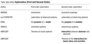 - “Cyberneticians have distinguished the recent work in cybernetics on constructivist epistemologies from the earlier work on control systems by using the term ”second-order cybernetics“. This term was first used by Heinz VON FOERSTER, who defined first-order cybernetics as the cybernetics of observed systems, whereas second-order cybernetics is the cybernetics of the observing systems (von FOERSTER, 1979). von FOERSTER intends the term ”observing systems“ to be interpreted in two ways: either systems that observe or the act of observing systems. Gordon PASK made a similar distinction when he defined first-order cybernetics as dealing with the purpose of a model, whereas second-order cybernetics deals with the purpose of the modeler. Francisco VARELA suggested that first-order cybernetics is concerned with controlled systems, whereas second-order cybernetics is concerned with autonomous systems” (1990, p.112).