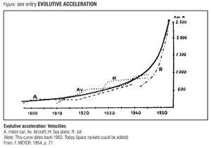 - However, there is a relay mechanism by which, when the evolutive curve of a phenomenon starts to accelerate, some new phenomenon, more powerful, appears. As an example MEYER uses the growth of human displacement velocities from the old horse postal express up to the rocket. Today, he could add the interplanetary explorers.