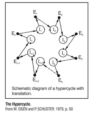 In M. EIGEN and P. SCHUSTER words: “A catalytic hypercycle is a system which connects autocatalytic or self-replicative units through a cyclic linkage”. More precisely: “… it consists of self-instructive units I$_{i}$ with two-fold catalytic functions. As autocatalysts — or more generally — as catalytic cycles the intermediate I$_{i}$ are able to instruct their own reproduction and, in addition, provide catalytic support for the reproduction of the subsequent intermediate” (1979, p.5).