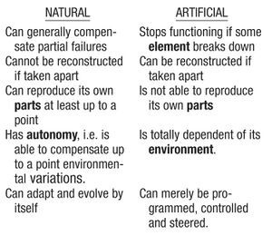 To put some order and avoid dubious isomorphies, it is possible to establish a comparison between specific characteristic of so-called “natural” machines and artificial ones.