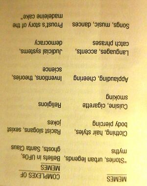 BLACKMORE gives the following list of memes and complexes of memes (2000, p.54):