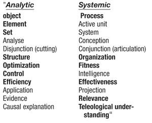 J.L.LE MOIGNE propose the following comparison between the analytic (i.e., applying a reductionnist method of successive decomposition) and the systemic (i.e. using a wholesale approach) modes of modelization (1990, p.9):see table next page