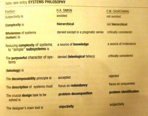 W. ULRICH (1983, p.321-3) has imagined a hypothetical debate between H.A. SIMON and C.W. CHURCHMAN, two outstanding systemists whose views are at odds on a number of points. ULRICH extracted the elements of this fictitious debate from SIMON's “Science of the Artificial” and from CHURCHMAN's “The Artificiality of Science”. Hereafter, a short summary of this debate (on which thesis ULRICH obtained both supposed contenders' agreement):